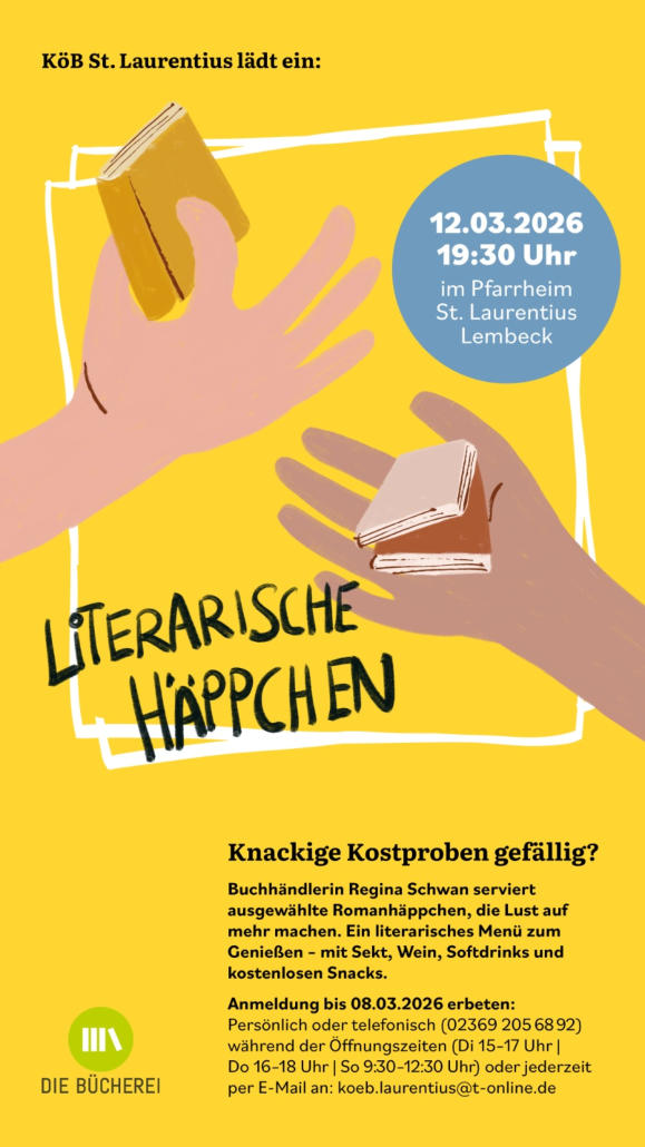 Kontakt Katholische öffentliche Bücherei St. Laurentius Am Pastorat 1 46286 Dorsten-Lembeck Tel. 02369 / 2056892 E-Mail: koeb.laurentius@t-online.de